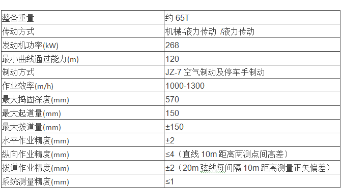 车辆集机、电、液、气一体,采用电液伺服控制、自动检测、计算机控制等先进技术。高速走行采用液力-机械传动,作业和作业走行采用液力传动,步进式双枕捣固作业方式,具有传动可靠、控制先进、操作方便等优点。